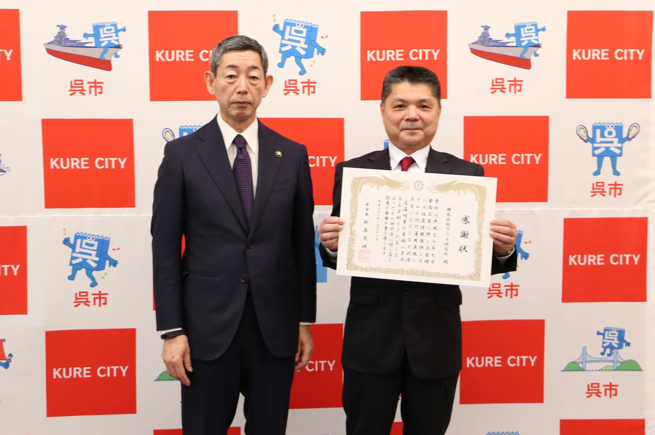 写真左:新原 芳明(呉市長)、写真右:太田 信夫(株式会社ヴァル研究所 代表取締役)
