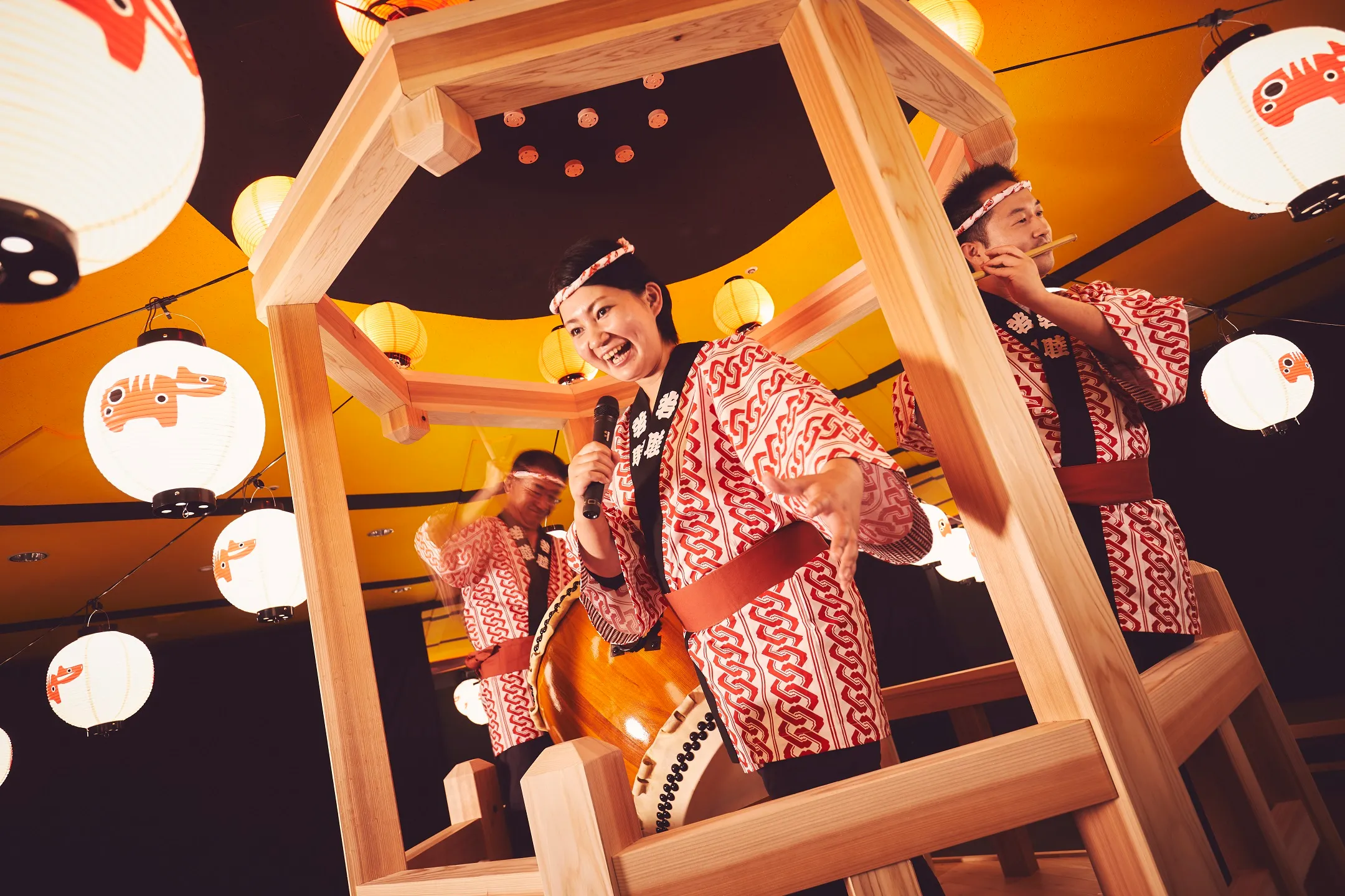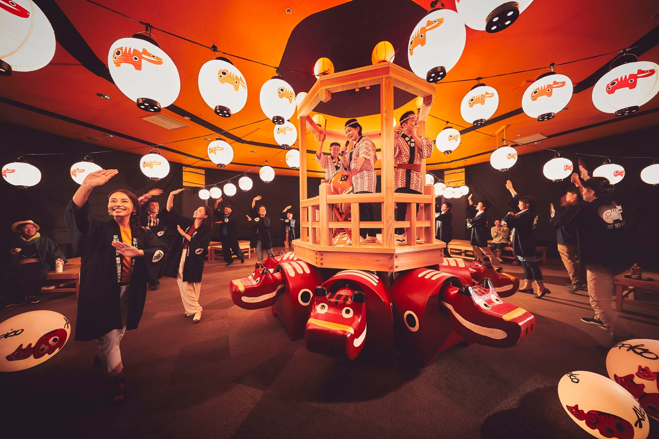 イベントでは、会津まつりの由来でもある提灯行列をテーマに、たくさんの提灯が会場を彩ります。入場の際、お祭り気分を高めてもらえるよう、赤べこを描いたオリジナルの半被を貸し出しします。また、酒どころでもある会津の祭りには欠かせない地酒の振舞いも行います。途中、民謡「会津磐梯山」の歌詞に登場する、お酒が好きすぎて身上を崩した会津の伝説の人物「小原庄助」さんが、どこからともなく登場。盃が空いているゲストを見つけては、お代わりのお酒を注ぎ回り、会場を盛り上げます。