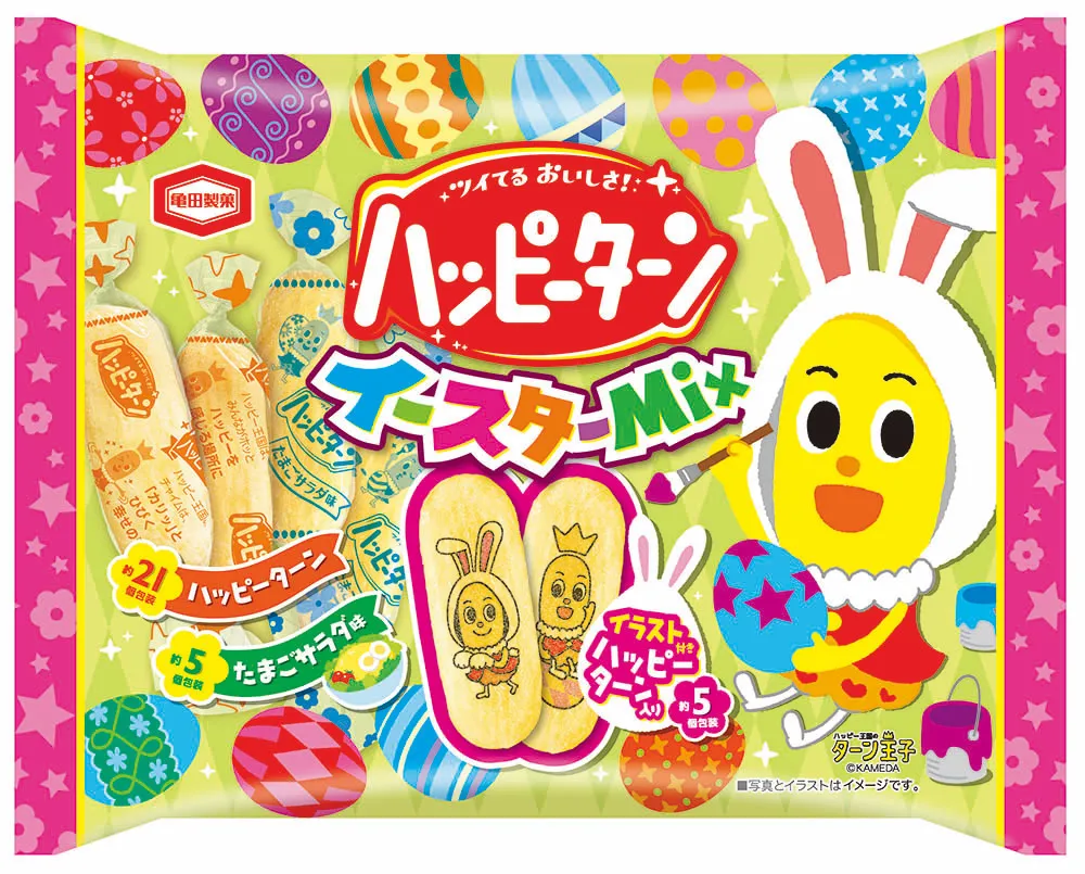 2016年から発売し、毎年ご好評をいただいている『ハッピーターン イースターMix』が今年も期間限定で登場します。いつもの「ハッピーターン」にかわいい「イラスト付きハッピーターン」と、イースターを想起させる「ハッピーターン たまごサラダ味」が入ったアソートパックで、パーティユースにぴったり。