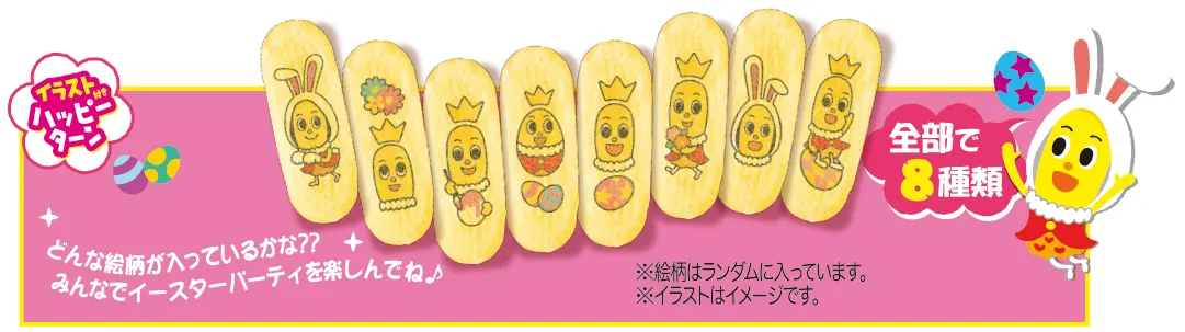 「イラスト付きハッピーターン」はうさぎの耳のかわいいターン王子など、全8パターンがランダムに封入されており、食べちゃうのがもったいないほど!また、「ハッピーターン たまごサラダ味」にはラッキー包み紙が入っていることがあります。見つけたあなたは超ラッキー!