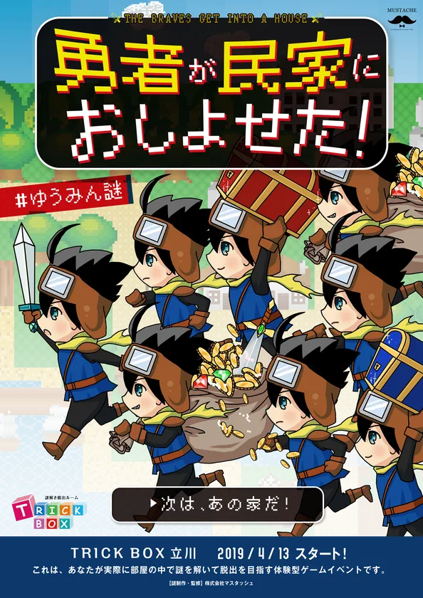 株式会社イグレックス(本社:東京都立川市、代表取締役:安原 大策)は、2018年10月にオープンた多摩地区初の常設型謎解き脱出スペース「謎解き脱出ルーム TRICK BOX(トリックボックス)」において、2019年4月13日(土)より新イベント「勇者が民家におしよせた!」および「四畳半の座敷牢からの脱出」を開催いたします。