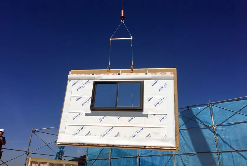 構造材・面材・間柱・断熱材・サッシ・一次防水までを一体化させたパネルを工場生産することで、1日で上棟、一次防水、施錠まで行い、大幅な現場での工期短縮を可能にします。木造大型パネルは在来の軸組み工法(金物工法)のため、特別な資材や技術を必要としないオープン工法で、すべての人に開かれた受託加工サービスです。
