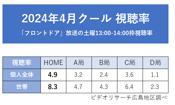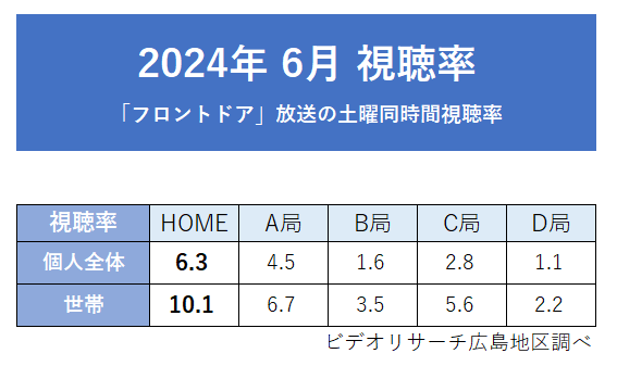 広島ホームテレビ「フロントドア」2024年度4月クール・6月月間視聴率 同時間帯1位を獲得!