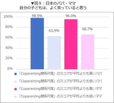 日本では、「Coparenting関係尺度」のスコアが平均よりも高いパパ・ママの9割以上が“よく笑っていると思う”と回答したのに対し(パパ:98.5%、ママ:96.0%)、「Coparenting関係尺度」のスコアが低いパパ・ママでは“よく笑っていると思う”と回答したのは6割程度(パパ:63.9%、ママ:66.7%)に止まっていることが明らかに。