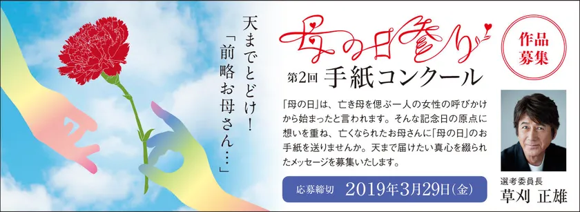 今回、新たな選考委員長への就任が発表された草刈正雄さんは1970年、男性化粧品CMでのデビュー以来、映画・ドラマ・舞台・CMに数多く出演、2016年のNHK大河ドラマ「真田丸」では“昌幸ロス”なる社会現象を惹き起こし、さらに今年4月期のNHK朝の連続ドラマ「なつぞら」への出演も控え、母を見送った世代の代表として『母の日参り』の意義を呼びかける、その社会的な発信力に大きな期待が寄せられます。
