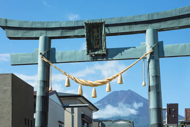 プログラムのはじめに、富士山の裾野に広がる富士吉田市で富士山信仰について学ぶツアーを実施します。金鳥居(かなどりい)と呼ばれる鳥居をスタート地点とし、約20分かけて「御師(おし)の家」を目指します。金鳥居は、江戸時代より富士山信仰の世界への入り口として重要な役割を担っています。また、御師の家は、400年以上に渡り富士山を信仰する人々の登山や宿泊を世話する宿坊です。辿り着いた御師の家では、登山に向かう人へ振る舞われる「御師料理」を昼食として食べ、当主から富士山信仰についての話を聞き、知識を深めます。その後、富士山登山道の入り口に位置する「北口本宮冨士浅間神社」へ参拝し、かつての富士登山者の足跡を辿ります。