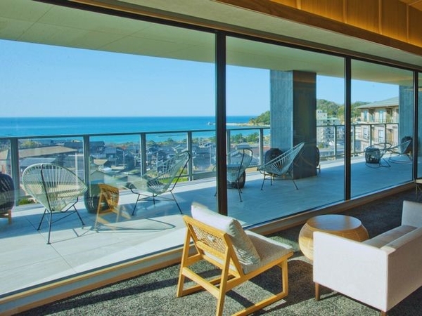 夕日ヶ浦の海と街並み、夕日を一望する絶好のロケーション。綾部の黒谷和紙作家「ハタノワタル」さんの作品が並ぶラウンジでは京丹後にゆかりのあるウェルカムドルチェが並ぶ。