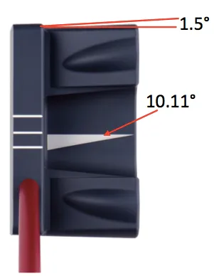 フェース面に対して1.5°裾広がりの傾斜を付けたフランジをカップに対してスクエアに構え、1.5°開いた状態にすると、0°~10.11°の範囲内でストロークすればカップインすることになり、ストロークの許容角が従来の5.61°の約2倍に拡大。ヘッド裏側のガイドラインも10.11°とし、ストロークの目安になります。