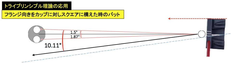 「カップまで1mの距離をスクエアにインパクトする場合、0°~5.61°の範囲内でストロークすればカップインする」という従来のトライプリンシプル理論を応用。