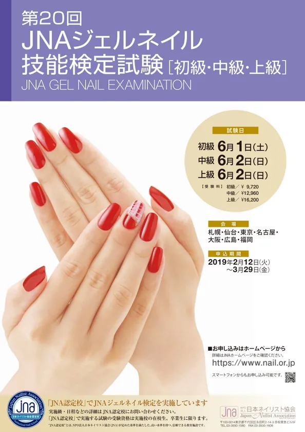 NPO法人日本ネイリスト協会(略称:JNA、東京都千代田区/理事長:瀧川 晃一)は、2019年6月1日(土)・2日(日)の2日間に渡り『第20回 JNAジェルネイル技能検定試験』を開催します。全国7都市での開催に向け、2月12日(火)より申し込みがスタートしています。