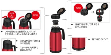 ・フタを閉めると自動的にロックがかかるオートロック式ボタン構造!