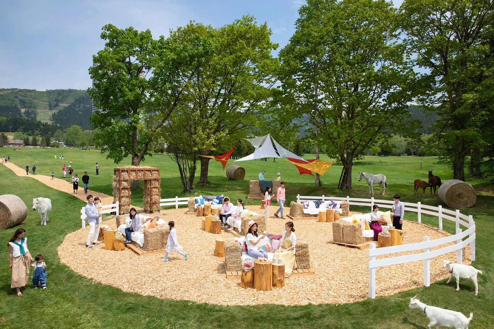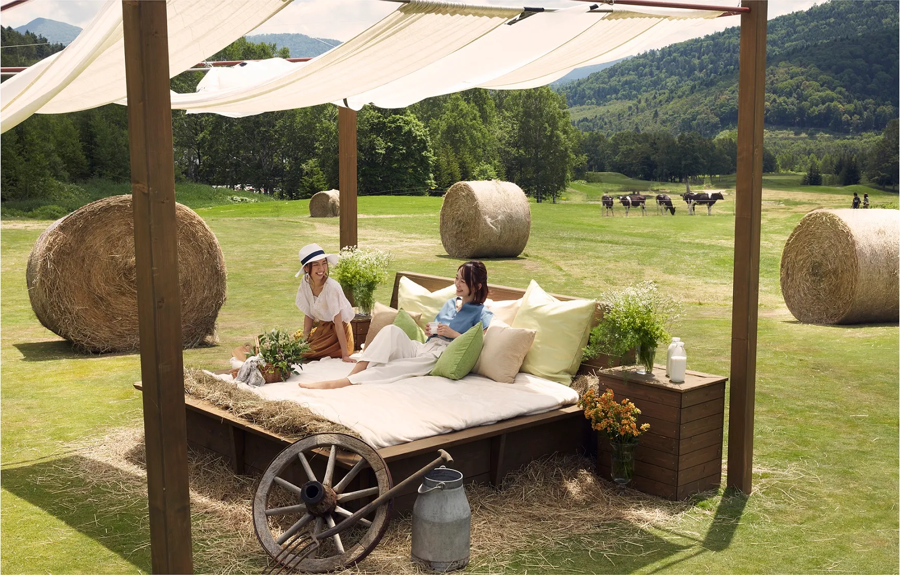 2018年7月に誕生した、牧場がテーマの屋外ラウンジです。牧草でできたソファに座り、雄大な自然を感じながらテイクアウトした軽食を堪能できます。