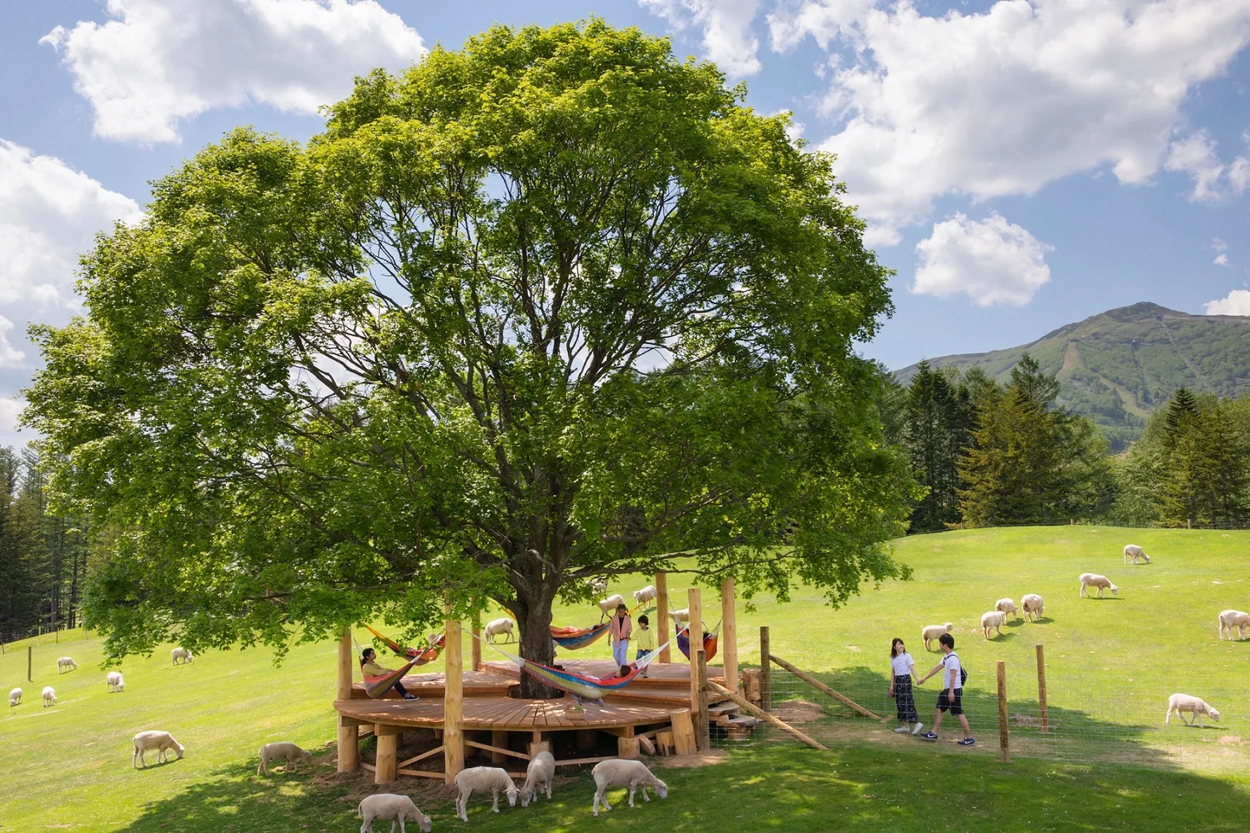 2018年4月に誕生した、本物の羊を数えながら昼寝を楽しめるスポットです。ハンモックに寝転ぶと、羊と同じ目線で景観を楽しめます。