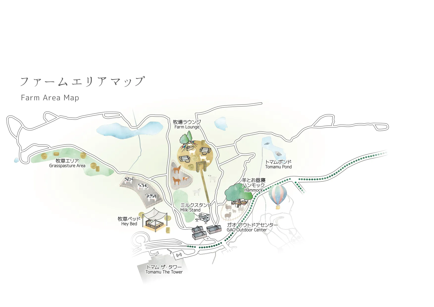 雄大な自然に囲まれた景観を眺め、滞在を楽しめる「ファームエリア」