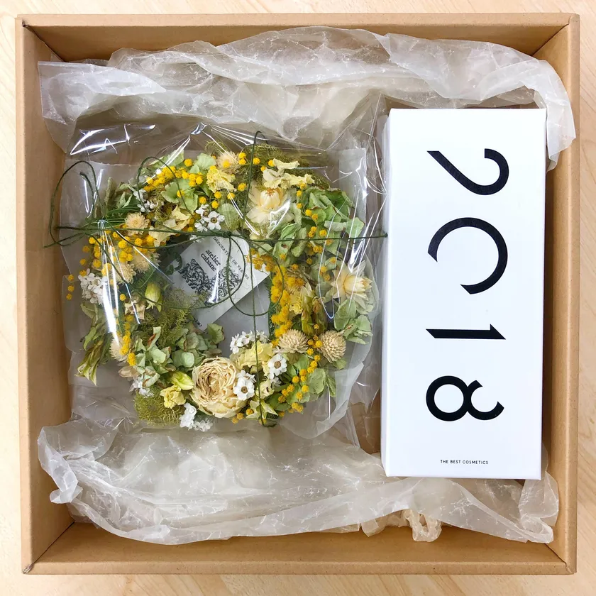 ホワイトデースペシャルBOXは、ギフトボックス入り「2.0.1.8」オイルクラッシュウォーターとatelier cabane(アトリエ・カバンヌ)様に特別にアレンジしていただいたグリーン&イエローベースのリースをセットにしたホワイトデーギフトにピッタリのスペシャルBOXとなっています。