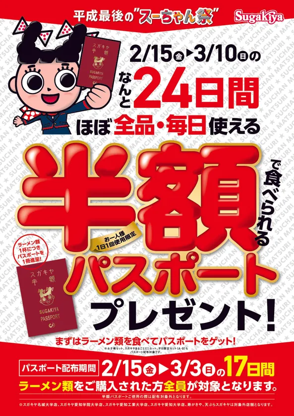今回の「スーちゃん祭」は今までにない新しい試みとして、「スガキヤ」329店舗で、2月15日(金)~3月3日(日)の期間中、ラーメン類1杯ご購入のお客様に「半額パスポート」を1冊プレゼントいたします。「半額パスポート」をお持ちのお客様に限り、2月15日(金)~3月10日(日)の期間中、ラーメン(320円→160円)を始め、ソフトクリームなどの定番メニューや味噌ラーメンなどの季節メニューを含むほぼ全ての商品が半額となる「感謝価格」にて1日1回ご利用いただけます。