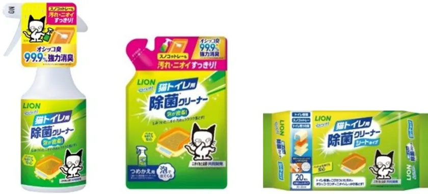 そこでこの度、当社独自技術を活用した猫トイレ掃除専用のお掃除用品を開発、「洗浄」「消臭」「除菌」の3つのはたらきで、猫トイレの汚れや強烈なニオイをスッキリ落として、トイレの清潔を維持する『シュシュット!猫トイレ用 除菌クリーナー』と『シュシュット!猫トイレ用 除菌クリーナー シートタイプ』を新発売いたします。