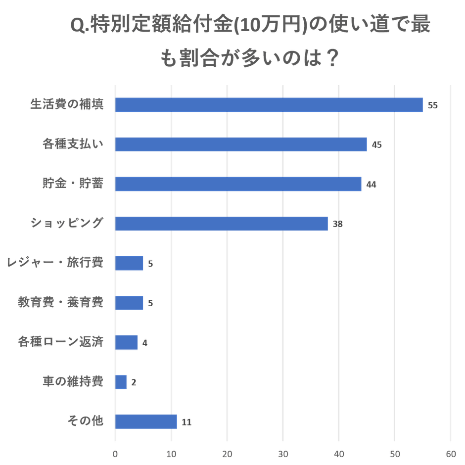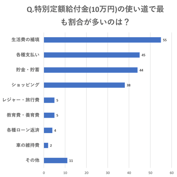 今回のアンケート調査で、10万円の給付金を生活費の補填や各種支払い、貯蓄・貯金に充てる人が多いことが分かりました。