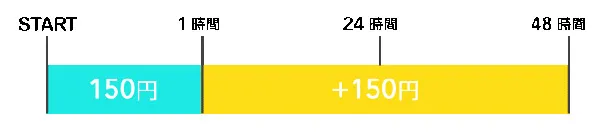 1時間⇒150円(税抜)、48時間以内⇒300円(税抜)、48時間以降⇒2,280円(税抜)