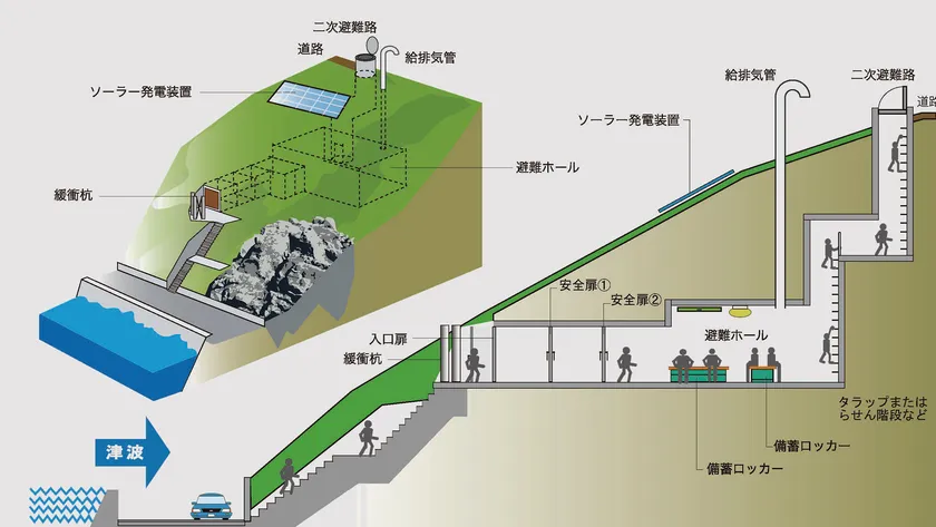 自然の地形を利用した横穴式の津波避難施設で、斜面の中腹に出入り口を設けた避難空間と、空間内部から崖地の上方に換気装置と脱出用の出入り口を設けています。また、内部には救出されるまでの期間生活できるように備蓄設備などを備えることができます。