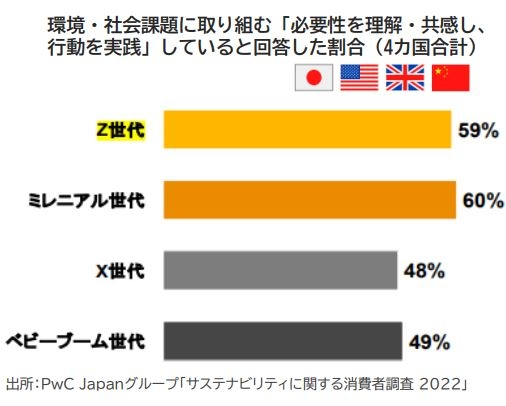 日本では、若い世代よりも高齢者の方がサステナビリティを意識して行動をする割合が高いが、下図の4カ国調査の通り、海外を含めるとZ世代やミレニアル世代などの若い世代の方が、環境・社会問題に取り組む「必要性を理解・共感し、行動を実践」していると回答している。 また、若い世代は環境問題だけではなく、ジェンダーや人権問題にも強い関心を示しており、一部の消費者においては、それらに関わる商品が購買行動に影響していると言う。日本の若い世代も例外ではなく、ジェンダーや人権問題の関心が強いとされている。