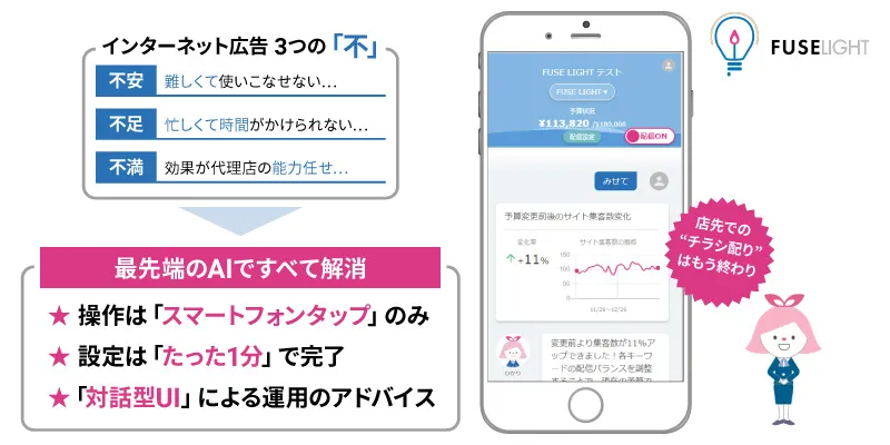 「FUSE LIGHT」は広告分野に携わったことがない人でも「誰でも」「気軽に」「簡単に」インターネット広告の運用が可能な自動配信・自動運用ソリューションです。
