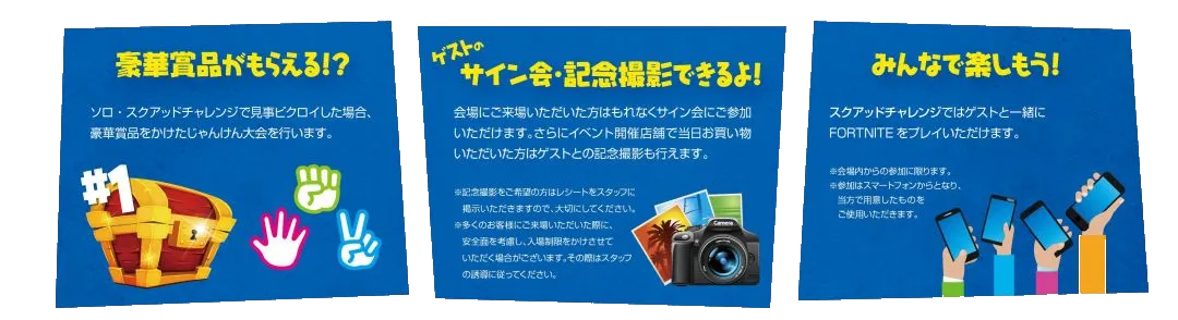 (2)FORTNITEのソロチャレンジ / スクワッドチャレンジには、なんとFORTNITEプロゲーミングチーム Crazy Raccoon フランシスコ選手が登場! 13時15分からのソロチャレンジの様子は、フランシスコ選手の動画チャンネルにて生配信を予定しています。更に、15時30分からはゲーミングスマートフォンを使用して参加のお客様を交えたスクワッドチャレンジも開催されます。