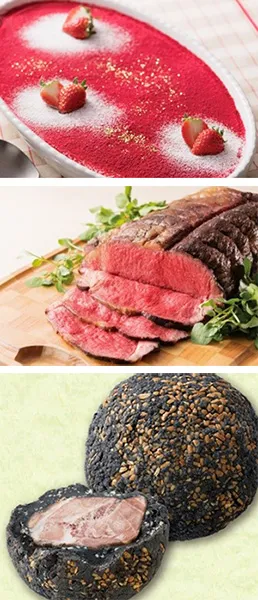 苺ティラミス、ローストビーフ、爆弾酢豚 ※カットし甘酢ソースをかけ提供