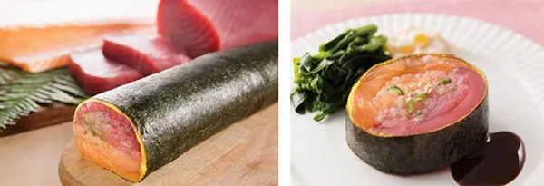 大砲をイメージして太めに巻いた、巻き寿司風の料理が登場!米を使わず、【まぐろ切り身・まぐろたたき・サーモン切り身・サーモンたたき】の4層で贅沢に仕上げました。味噌ベースのタレとサーモンマヨを添えて。