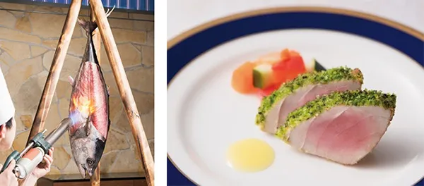 近年も専門店が新しくオープンするなど、人気が絶えないまぐろとサーモン。さらに、サーモンは“ご当地サーモン”も徐々に注目を集めており、回転寿司でも一番人気のネタと言われています。オリンピアではそんな人気食材が食べ放題のフェアを開催。日本料理では、まぐろとサーモンを存分に味わえる巻き寿司風のひと品をご用意。西洋料理ではまぐろを吊るして巨大バーナーで炙ったり、中国料理では目の前でサーモンの上から熱々のピーナッツ油をかけて火を入れるなど、オリンピアならではの臨場感あふれるパフォーマンスもお楽しみいただけます。