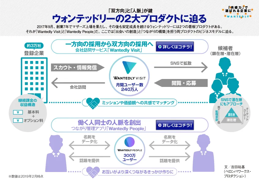 創業7年でマザーズ上場を果たし、その後も安定成長を続けるウォンテッドリーには2つの看板プロダクトがあります。出会いの創造とつながりの構築を担う「Wantedly Visit」と「Wantedly People」のビジネスモデルに迫ります。