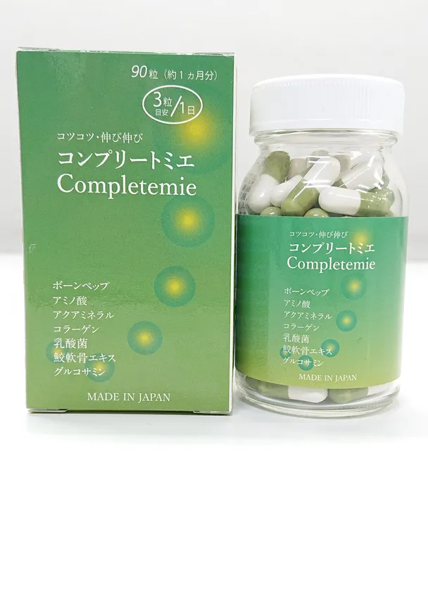 「コンプリートミエ」は卵黄ペプチド由来の「BONEPEP(ボーンペップ)」を主成分とした成長サプリメントです。「コンプリートミエ」には「BONEPEP(ボーンペップ)」の他にもカルシウムや、マグネシウムなどのミネラルを豊富に含む海藻類由来の「アクアミネラル」、コラーゲン・コンドロイチン・グリシン・グルコサミン・アルギニンなどのアミノ酸、また、天然成分の「アキノワスレグサ(クワンソウ)」が含まれています。