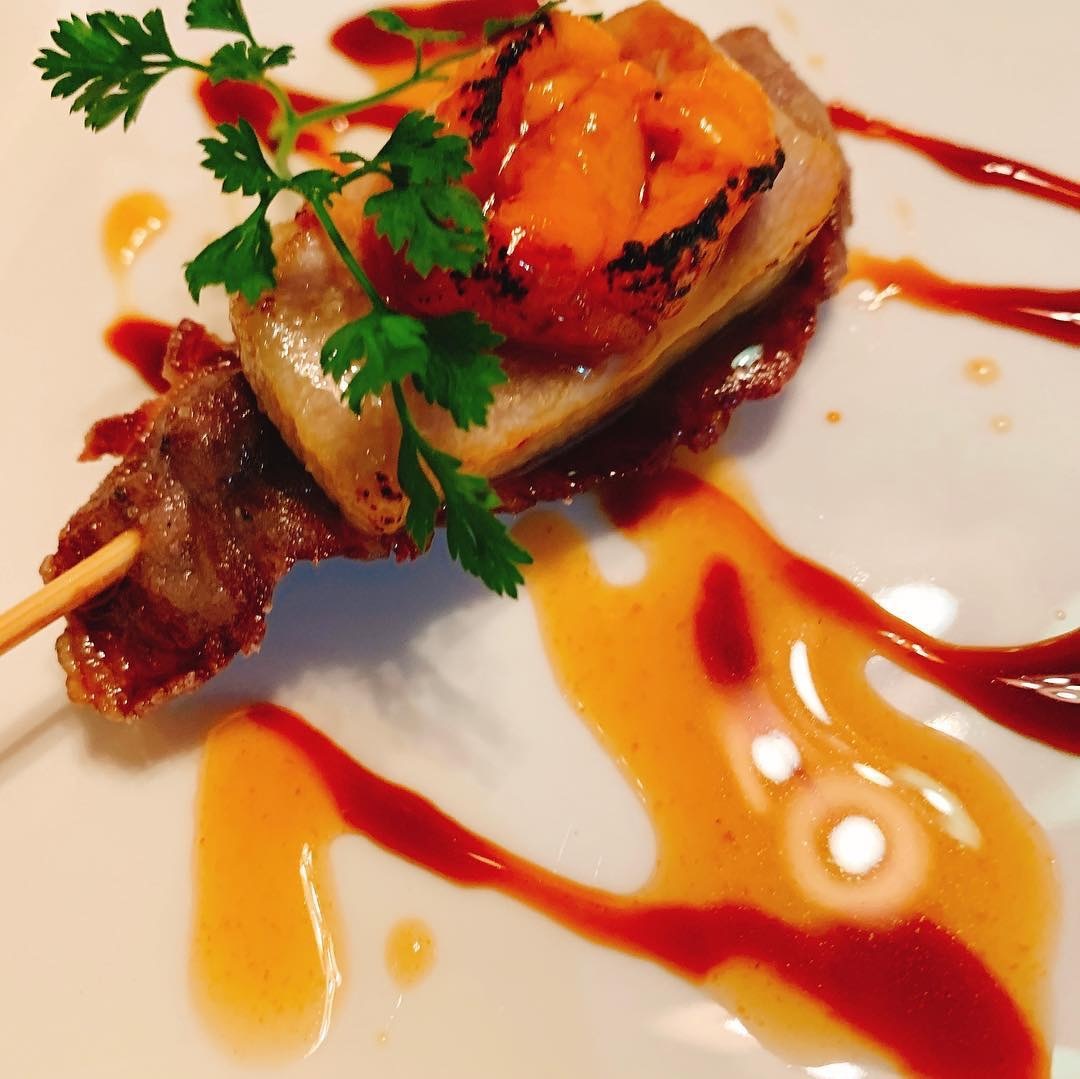 ・牛タンと白子の串アヒージョ ポン酢ジュレ