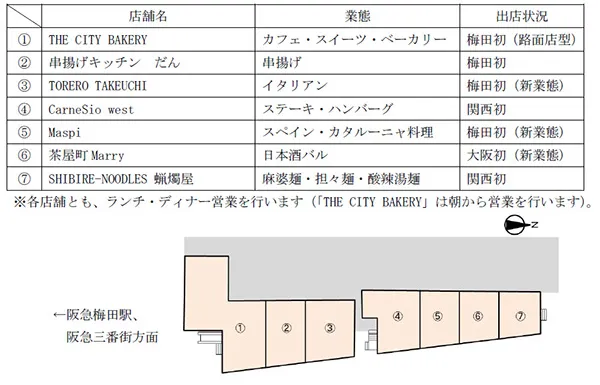 現在、大阪市と阪急電鉄は、同高架の東側「(市道)梅田北野線」の歩道を拡幅・美装化する等の整備工事を進めています。これにあわせて、梅田・茶屋町エリアの“まち歩き”をより楽しんでいただけるよう、歩道沿いに路面型の店舗を新たに配置し、飲食街「茶屋町あるこ」をスタートさせます。お越しになるお客さまの気分や目的に合わせて選んでいただけるよう、「ベーカリーカフェ」、「串揚げ」、「イタリアン」、「ステーキ」、「スペイン料理」、「日本酒バル」、「中華」といったバラエティ豊かな7店舗をラインアップし、“食へのこだわり”をもつお客さまにもお楽しみいただけるよう“上質で洗練された飲食街”を目指します。