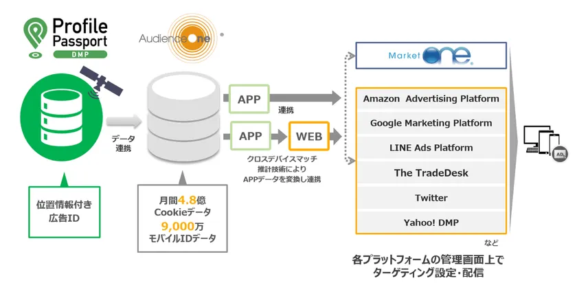 このたび、デジタル・アドバタイジング・コンソーシアム株式会社(本社:東京都渋谷区、代表取締役社長CEO:島田 雅也、以下 DAC)と株式会社ブログウォッチャー(本社:東京都中央区、代表取締役:戸田 洋平、以下 ブログウォッチャー)の両社は、DACが提供するDMP「AudienceOne(R)」(※1)とブログウォッチャーが提供する「プロファイルパスポートDMP」(※2)の連携を活用した広告配信サービスを開始しました。これにより広告会社や広告主は、スマートデバイスのアプリから得た位置情報データを活用し、デバイスを問わず、DSP「MarketOne(R)」をはじめとしたさまざまなプラットフォームでの広告配信が可能となります。