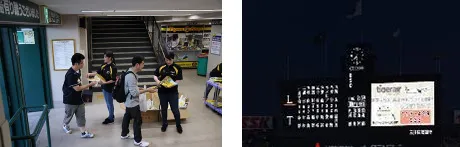 (左)抽選付きうちわの配布(昨年の様子) (右)場内ビジョンで当選者の発表(昨年の様子)