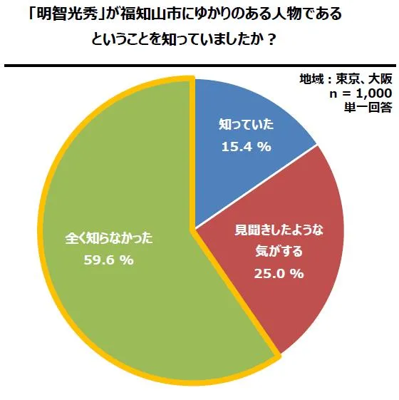 福知山市の「明智光秀ゆかりのまち」としての認知度について、「知っていた」という回答は15.4%、「そのようなことを聞いたことがある」との回答の25.0%と合わせても、明智光秀と福知山の関係を認識するのは4割に留まっています。