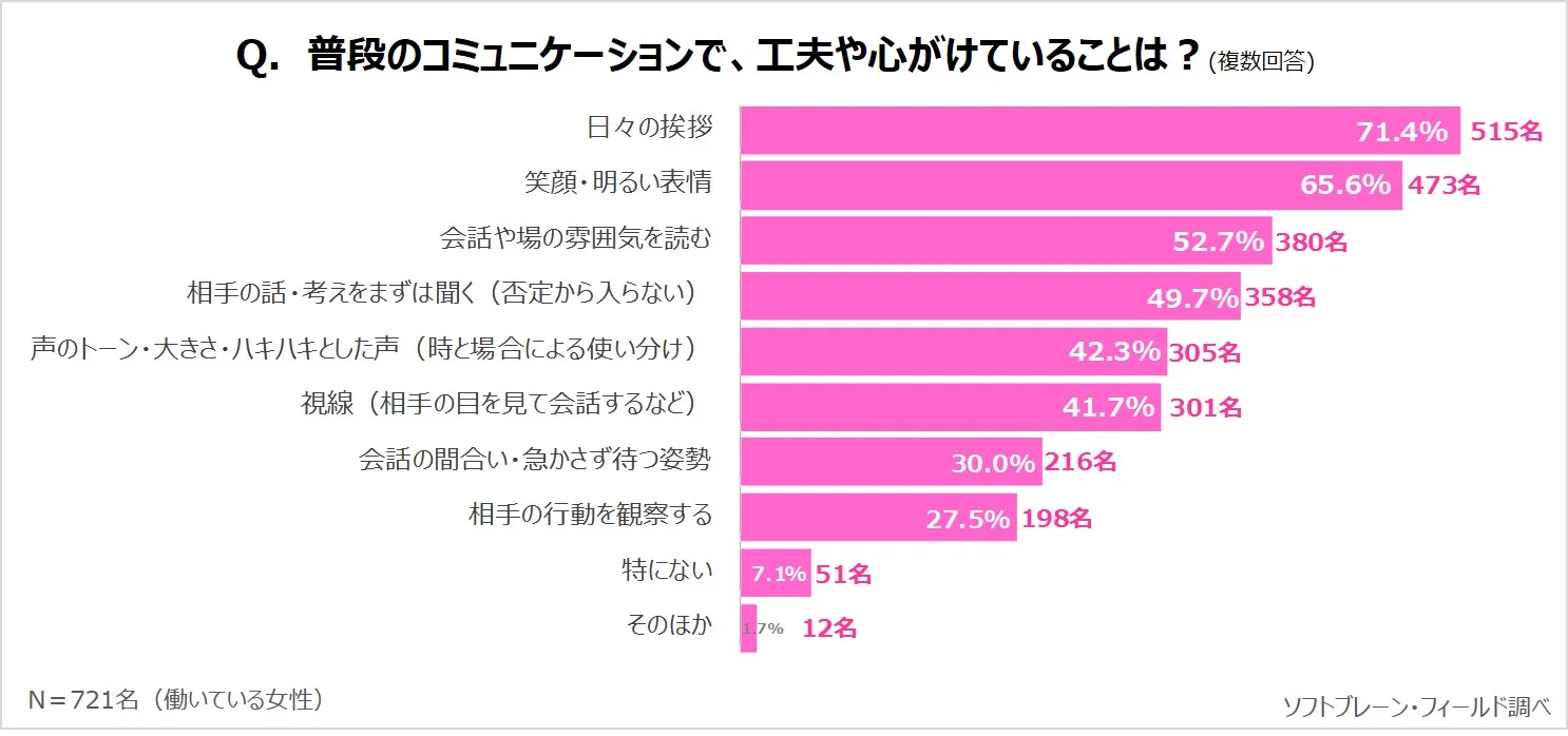・普段のコミュニケーションで工夫や心がけていることについては、「日々の挨拶」が71.4%でもっとも多く、「笑顔・明るい表情」が65.6%と続き、相手と友好的な雰囲気や印象を与える工夫をしている。次に、「会話や場の雰囲気を読む」が52.7%で、相手をよく観察し、共通点や興味を引き出して、言葉に発していない様々な情報を得られるよう心がけている。