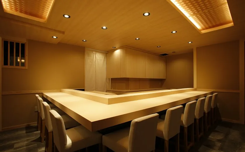 カウンター鮨コースは、その日仕入れた最高の食材を使い、先付け、お造り、焼き物、小鉢、おつまみ、握り、留椀、甘味の全11品で構成しており、それぞれのお客様の料理のお好みや地酒やワインなど、お飲み物の進み具合に合わせてご提供いたします。鮨カウンターならではの空気感の中で、熟練の鮨職人と15年以上割烹/日本料理店で研鑽を積んだ和食職人それぞれの技を駆使した、旬の品々を2時間半程度ゆっくり味わって頂けるコースです。