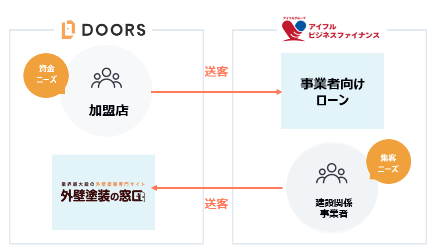 ドアーズが運営する業界最大級の外壁塗装専門サイト「外壁塗装の窓口」は、約4,000社の塗装店を中心としたNo.1の加盟店ネットワークを有しております。資金ニーズを満たすことで事業拡大を実現できる加盟店事業者様に対して、アイフルビジネスファイナンスが提供する事業者向けローンの紹介を行って参ります。