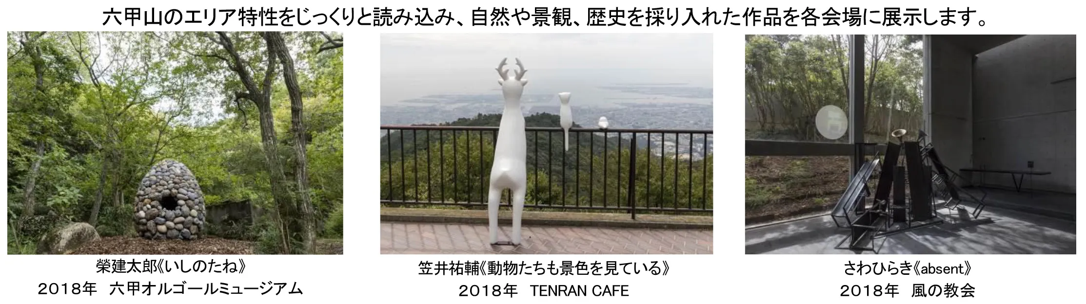 六甲山のエリア特性をじっくりと読み込み、自然や景観、歴史を採り入れた作品を各会場に展示します。