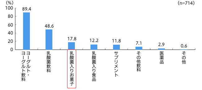 乳酸菌の摂取方法は全体で「ヨーグルト・ヨーグルト飲料(89.4%)」、「乳酸菌飲料(48.6%)」、「乳酸菌入りお菓子(17.8%)」の順となりました。