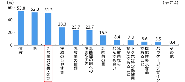 乳酸菌入りの食品・飲料・サプリメントを摂取する時に重視していることは、トップ3が僅差で「値段(53.8%)」「味(52.0%)」「乳酸菌の効果・効能(51.3%)」になりました(図4)。