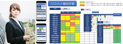 サービスは、自社のハラスメント対応状況回答・集計ツール、ハラスメントを受けた、あるいは見聞きした場合の実名・匿名報告ツール、発生しているハラスメントの部署毎・全社での時系列での一覧表示、対応策の実施・管理システムから構成されています。