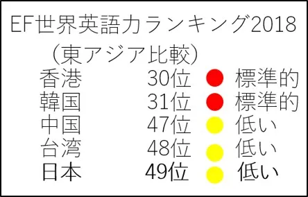 EFが発表した2018年英語能力指数の世界ランキング(※)において、日本人の英語能力は88か国中49位でした。東アジアの近隣諸国と比較すると、日本人の英語力が低い順位となっているのがわかります。