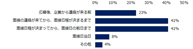ほとんどの方が前日までに企業へ連絡をしていますが、中には「面接日当日」(8%)に辞退という方もいることが分かりました。