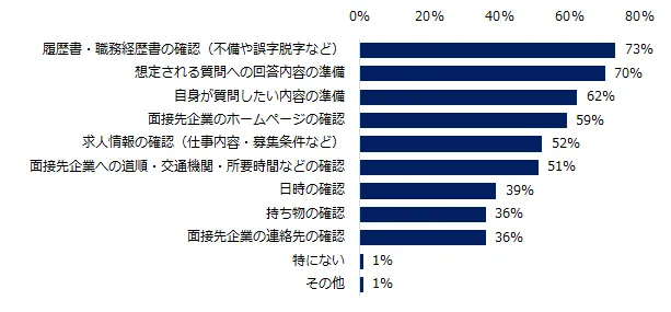 面接準備としてやっておいたほうがよいと思うことを伺うと、「履歴書・職務経歴書の確認(不備や誤字脱字など)」(73%)が最多でした。理由を伺うと、「意外に履歴書、職務経歴書の誤字脱字は多い。手書きの場合はミスがよくあるので、冷静にもう一度見直したほうがいい」(24歳男性)、「誕生日を迎えて、年齢が変わったのにそのまま提出してしまったことがありました」(31歳女性)という声が寄せられました。