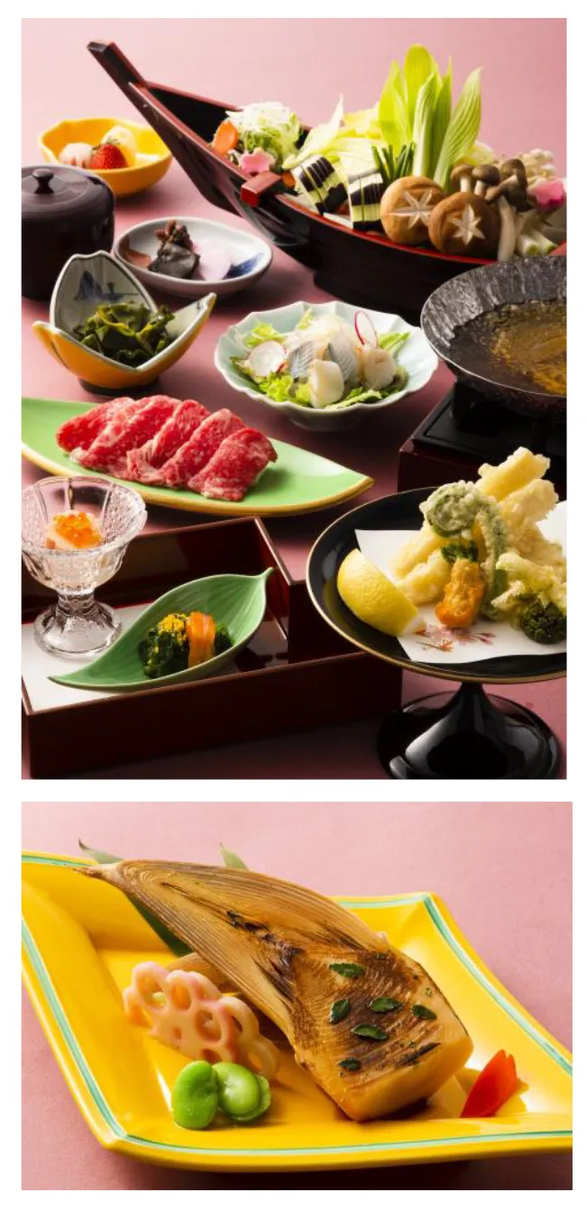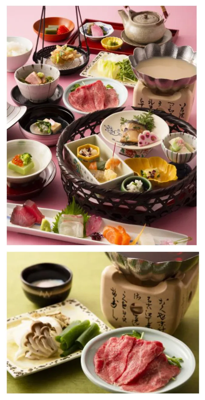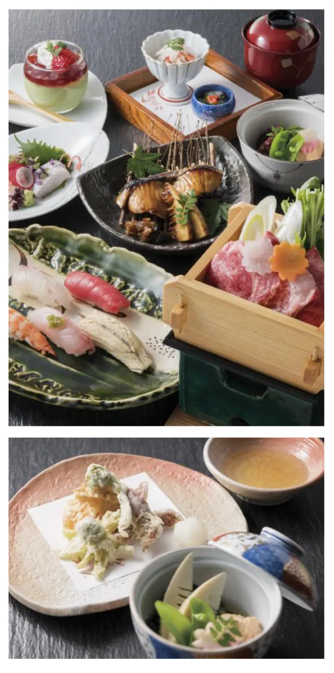 春の訪れを感じる旬の素材を活かした割烹料理。洗練された技が光るにぎり寿司やお肉料理は蒸篭(せいろ)蒸しまたは牛しゃぶをお好みでお楽しみください。
