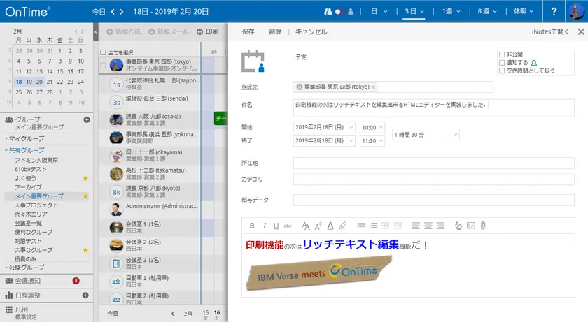 IBM Notes/Domino、IBM Verseと、Microsoft Exchange、Office 365とのハイブリッド環境において、ユーザーのカレンダースケジュール、会議室などを一覧で表示、ミーティングの作成だけでなく共通のHTMLエディターのよる編集が可能です。