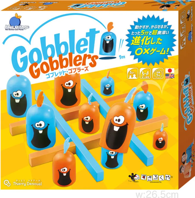 トサカが付いたキュートなゴブラーズ駒が可愛らしい、立体的な三目並べ、といった趣があります。 囲碁や将棋などに近い、理詰めで考えるゲームではありますが、「被せの中のコマが何だったか忘れてしまう」ことによる「あっ!」と驚くアクシデントがあって盛り上がります。